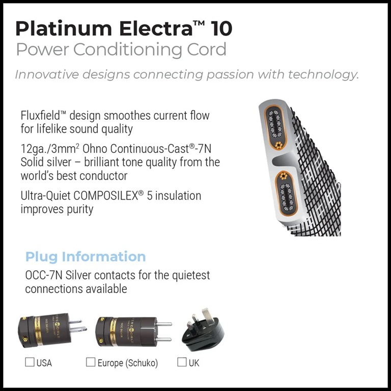 Dây nguồn Platinum Electra 10 Power Conditioning Cord thể hiện cam kết của Wireworld về việc sản xuất dây AV tốt nhất thế giới, bất kể chi phí.