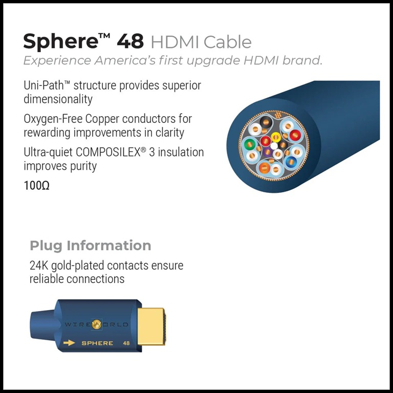 Giống như phiên bản tiền nhiệm, Sphere 48 mang lại chất lượng âm thanh hàng đầu phân khúc, đồng thời hoàn thiện những ưu điểm vượt trội của công nghệ hiển thị hình ảnh thế hệ mới nhất. Sự kết hợp giữa thiết kế Uni-Path™ độc quyền của Wireworld và lớp chống nhiễu/cách điện COMPOSILEX 3 siêu tĩnh mang đến khả năng cải thiện chất lượng âm thanh và hình ảnh vượt trội, khó có đối thủ sánh kịp. Sợi cáp HDMI tốc độ cao này vượt các tiêu chuẩn ngành về truyền dẫn 48Gbps, đảm bảo hỗ trợ đầy đủ mọi tính năng của HDMI 2.1, bao gồm độ phân giải 8K, Dynamic HDR, VRR, HDCP 2.3, 48 Bit Deep Color (3 x 16) và eARC (Enhanced Audio Return Channel). Cáp cũng tương thích với các kết nối âm thanh high end I2S.