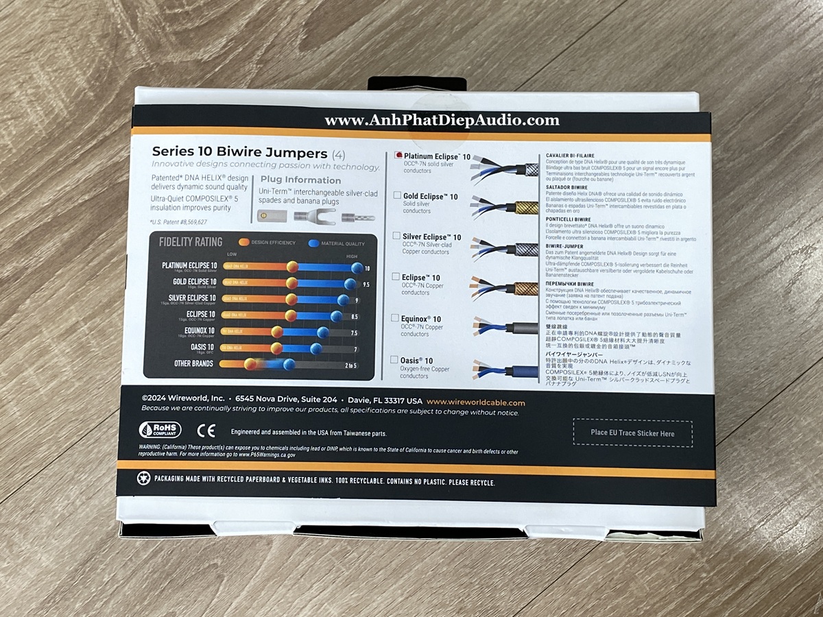 Bộ cầu loa Platinum Eclipse 10 mang lại độ trung thực cao nhất khi chuyển đổi dây loa chuẩn 2 cực sang loa có ngõ vào 4 cực biwire. Các dây dẫn bằng lõi Solid bạc OCC-7N tinh khiết nhất thế giới tái tạo chất âm chân thực nhất trên các hệ thống âm thanh hi-end. Để bảo toàn tốt nhất những thông tin âm nhạc tinh tế, khuyến nghị nối dây loa trực tiếp vào cọc tần số cao và dùng jumper để nối với cọc tần số thấp. Các mũi tên trên jumper cũng nên hướng về phía cọc tần số thấp. Bộ cầu loa gồm 4 sợi cầu nối, đầu cắm dạng Banana hoặc Spade. Chiều dài jumper là 6 inch (khoảng 15 cm).