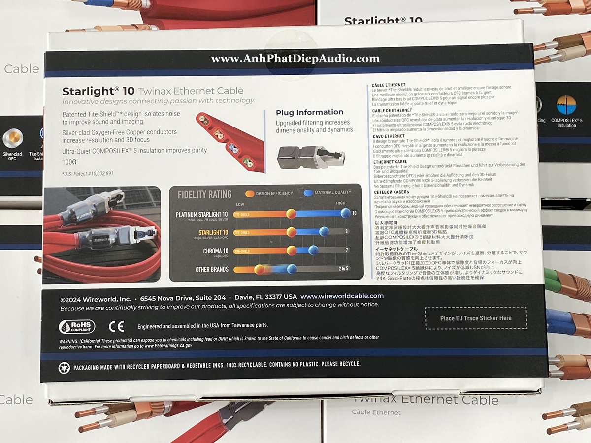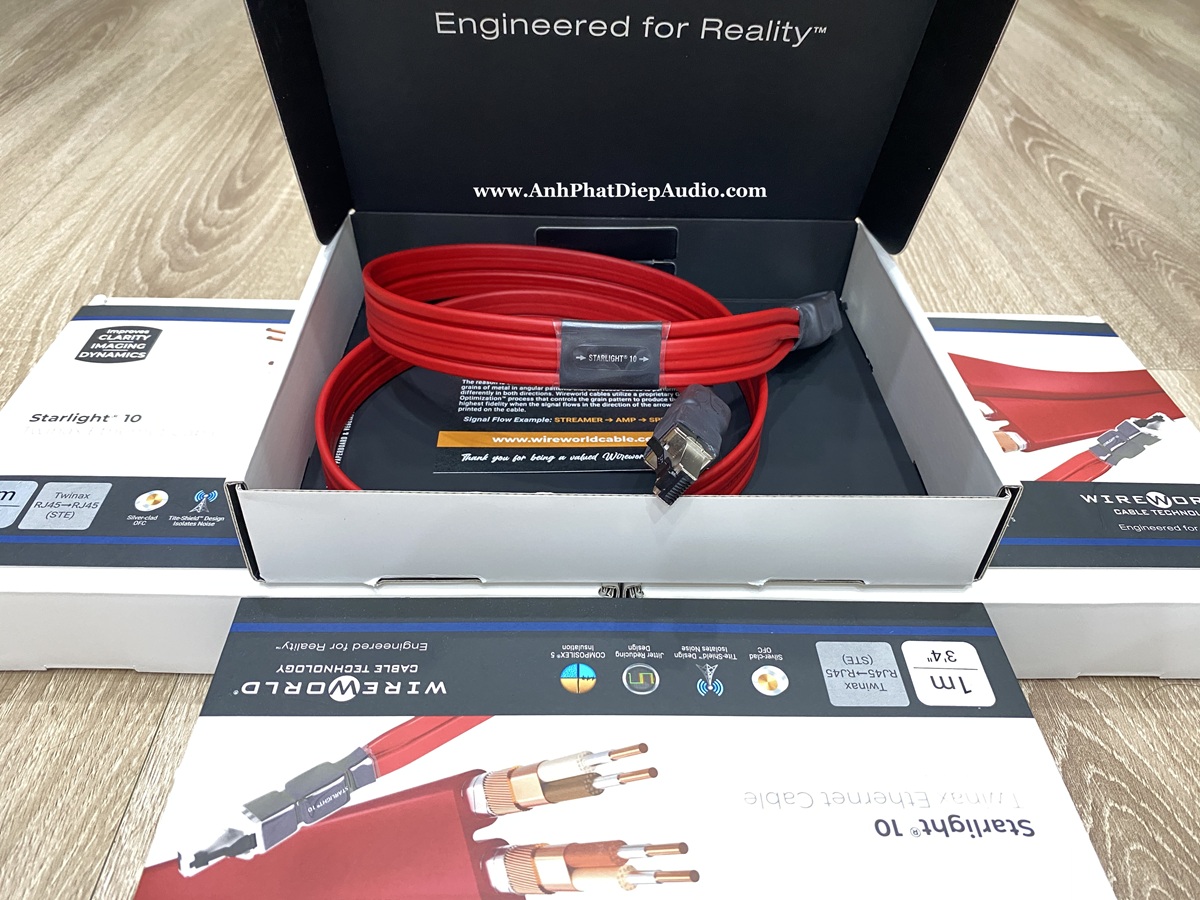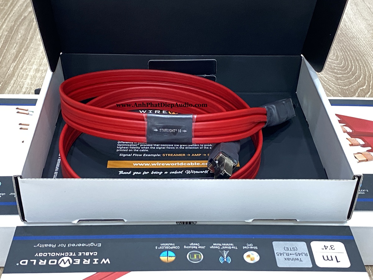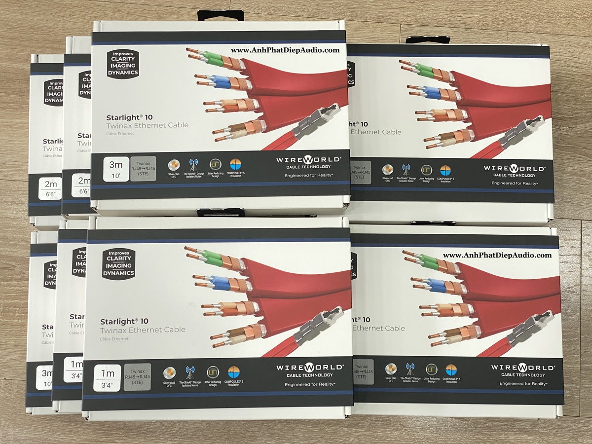 Dây cáp Wireworld Starlight 10 Ethernet sử dụng các sợi dẫn OFC mạ bạc trong cấu trúc cải tiến twinax song song, dẹt, giúp cách ly nhiễu mạng để tái tạo âm nhạc và video trực tuyến một cách sống động và chân thực nhất. Thiết kế Tite-Shield™ được cấp bằng sáng chế có mười hai lớp che chắn bên trong, giúp cô lập nhiễu và cải thiện chất lượng âm thanh cũng như hình ảnh.